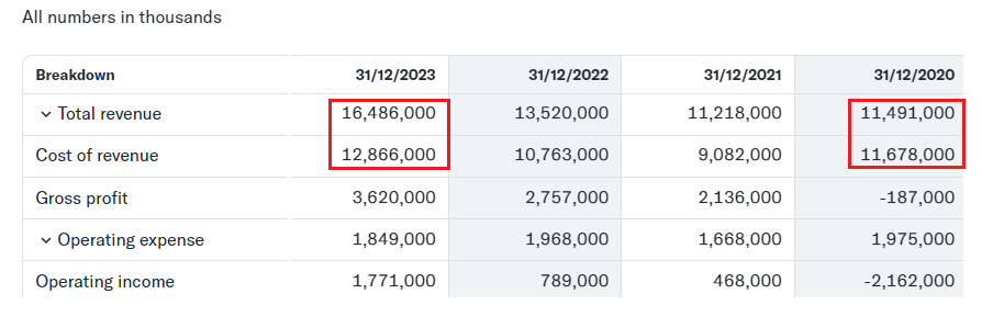 Rolls-Royce have managed to convince their clients to pay 1000 times more than an ordinary car. Through business we know, fixed costs have a upper ceiling once reached it stays constant. Also the material cost follow the same principles. Now R&D is included within the fixed costs, we can figure out that fixed costs & material costs etc = Cost of Revenue are moving(up & down) within 13.5 billion to 15.5 billion since 2020.
